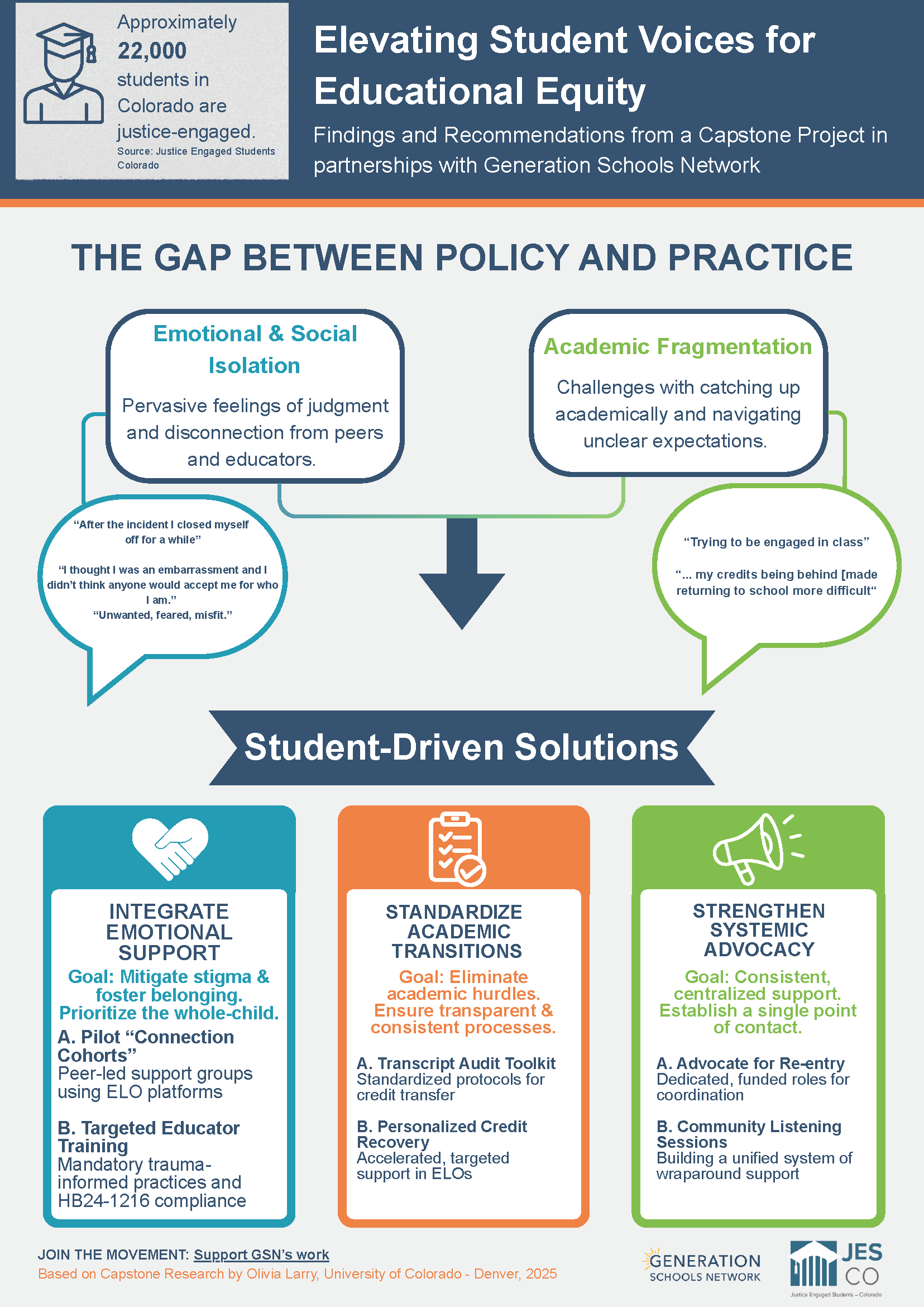 Capstone research by Olivia Larry (University of Colorado - Denver, 2025) draws on the 100 Voices survey and reveals the gap between policy and practice when it comes to justice engaged students.